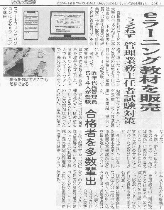 2025年3月25日発行の「マンション管理新聞」第1298号(20ページ)に、「管理業務主任者チャレンジ講座」の外販を開始した記事が掲載されました。