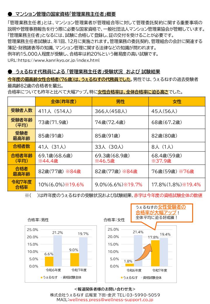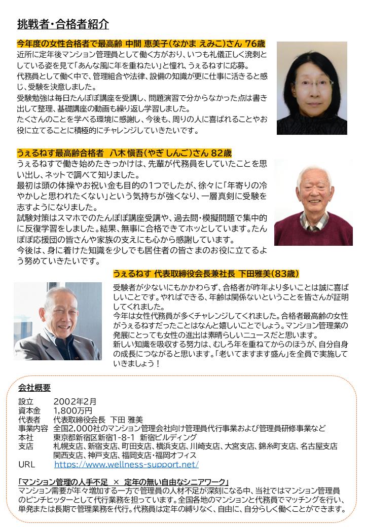 今年は女性代務員が多くチャレンジしてくれました。合格者最高齢の女性がうぇるねすだったことはなんと嬉しいことでしょう。マンション管理業の発展にとっても女性の進出は素晴らしいニュースだと思います。