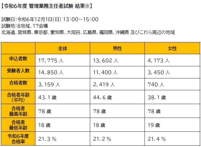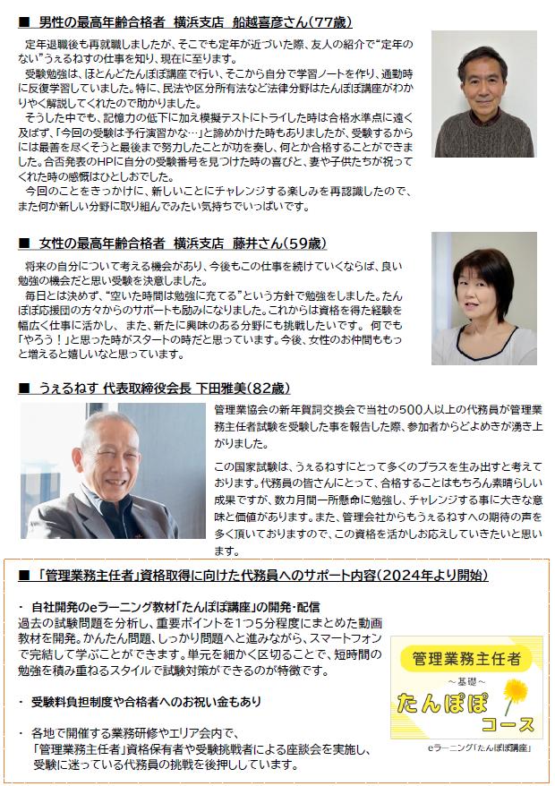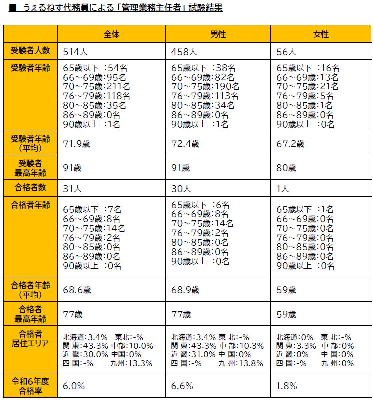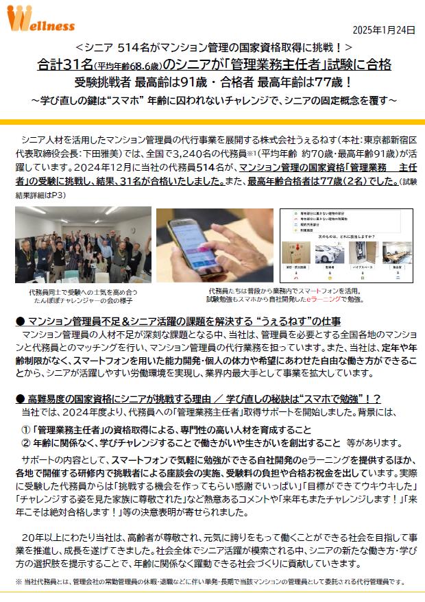シニア人材を活用したマンション管理員の代行事業を展開する株式会社うぇるねす(本社:東京都新宿区代表取締役会長:下田雅美)では、全国で3,240名の代務員※(平均年齢約70歳・最高年齢91歳)が活躍しています。2024年12月に当社の代務員514名が、マンション管理の国家資格「管理業務主任者」の受験に挑戦し、結果、31名が合格いたしました。また、最高年齢合格者は77歳(2名)でした。