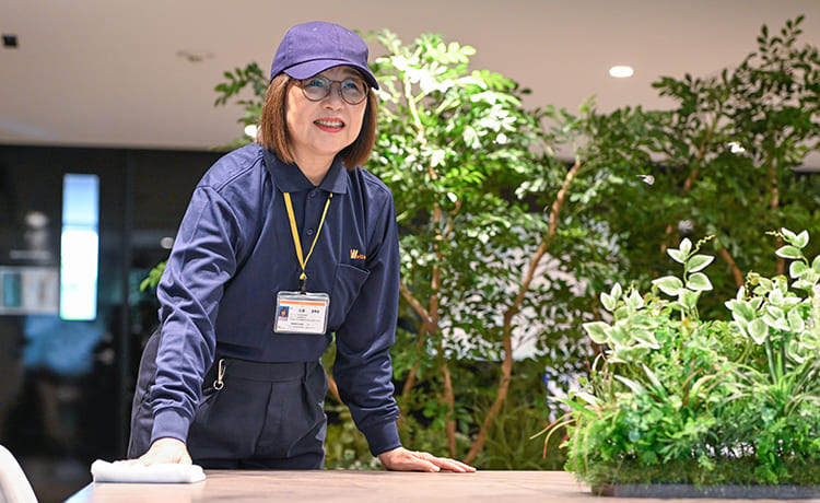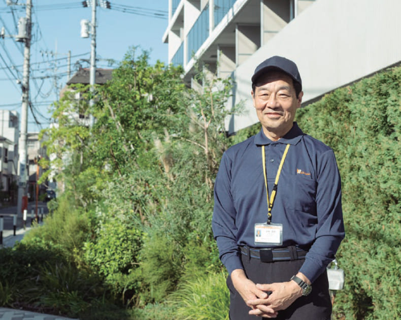 行き届いた清掃ですべてを清々しく仕上げて、どんなに忙しくても居住者様には必ず立ち止まり、目を見て笑顔で「おはようございます」。それは、ご近所の皆さま、宅配や来訪者の方にも同様です。