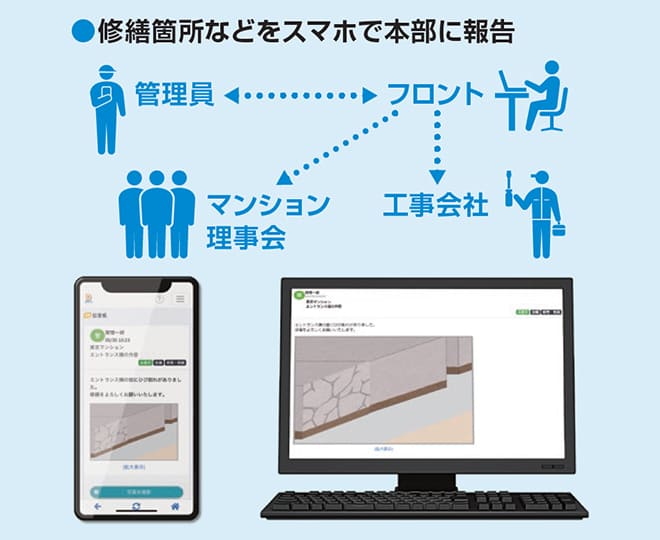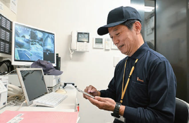マンションの現場情報を徹底的にデジタル化し、本部で共有できる情報ネットワークに即アップします。それが、情報ネットワーク用のアプリ『Dマネ』。このI T武装により、管理員は『デジタル・シニア』へ。フロントは、デスクで情報を受け取り、発信するだけ。
