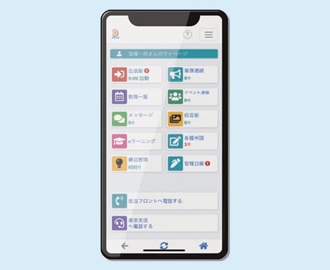管理員は、アプリ『Dマネ』をスマホにダウンロードするだけ。マイページの設定でスタートすると、すべての情報がオンラインでフロント/全社とつながり、情報流通の円滑化によって劇的な効率アップが実現します。